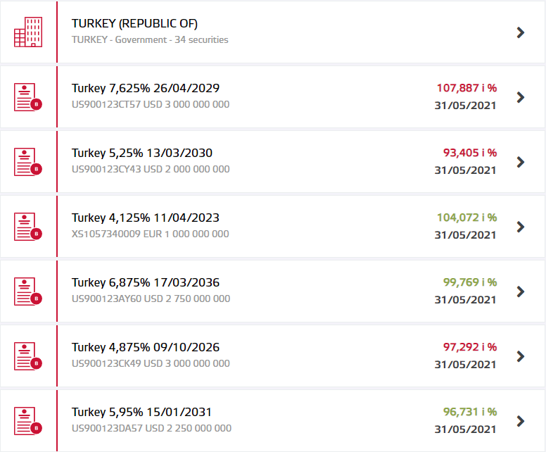https://www.bourse.lu/ sitesinden Turkiye Cumhuriyeti’nin ihraç ettiği eurobondlar ile ilgili, faiz oranlari, vade süresi, geçmiş fiyatı gibi bilgilere ulaşılabilir.