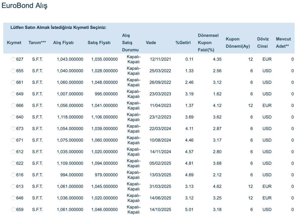 Akbank ve Vakıfbank’ta 1000 usd adet (nominal) ve katları şeklinde alım satım yapılabilmektedir. Türkiye Cumhuriyeti Devleti’nin çıkardığı ve toplamda 34 adet halen alım satım yapılabilir eurobond bulunuyor. Bunların 29u usd, 5 tanesi ise euro cinsinden.