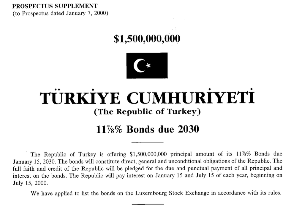 Örnek olarak 1000 adet US900123AL40 eurobond’u satın almak için şu an ödenmesi gereken tutar 1428,16 USD. Fakat vadesi bitince bunu 1000 USD olarak geri alacağız. Buna karşılık 6 ayda bir ödeyeceği faiz 59,38 USD oluyor. Toplamda 2030 yılında vadesi bitine kadar alacağımız faiz tutarı 1059,38 USD oluyor.