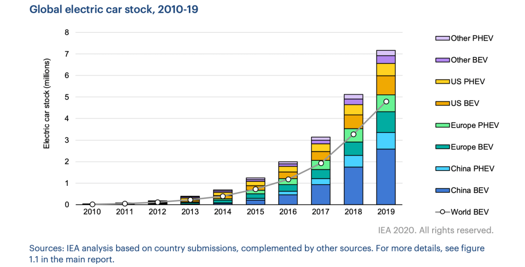 Elektrikli araç satışları son yıllarda hızlı biçimde artarak ilk kez 2018 yılında 2 milyonu geçmiştir. 2020 yılında ise bu rakam 3.1 milyona çıkmıştır. 2020 yılında toplam satışların yaklaşık olarak %5’ini elektrikli araçlar oluşturmuştur. 2010 yılında 17 bin adet elektrikli araç yollarda iken 2019 yılında bu rakam 7.2 milyona çıkmıştır. Bunun rakamın %47’sini Çin, %25’ini Avrupa ülkeleri ve %20’sini Amerika oluşturmaktadır.
