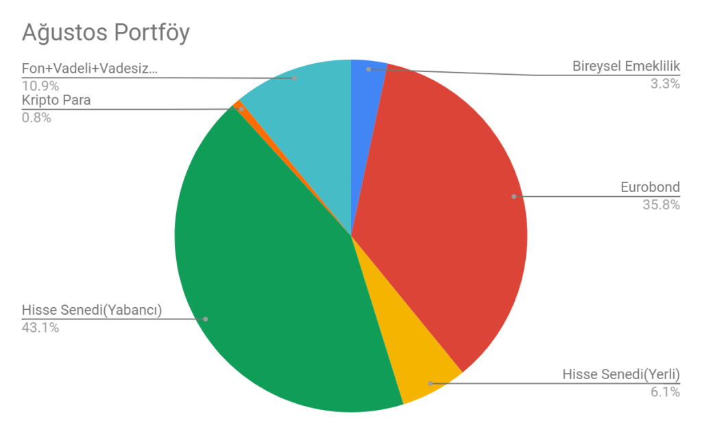 Ağustos’taki portföyün dağılımı aşağıdaki şekilde. Yerli hisse senedinin ve kripto paranın payı bir önceki aya göre biraz daha arttı.