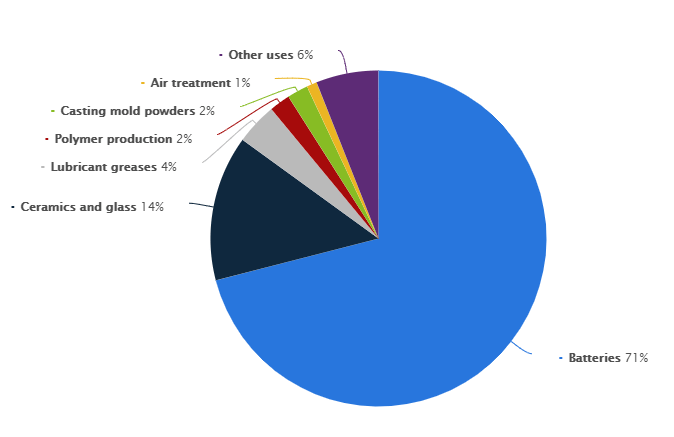 Lityum, en çok batarya üretiminde ve sonrasında cam ve seramik sektöründe ve onun dışında gres yağı üretiminde, klima ve endüstriyel kurutucularda, kaynaklarda, sağlık sektöründe, kozmetik, boya, waks üretiminde ve diğer birçok endüstriyel üründe kullanılmakta.